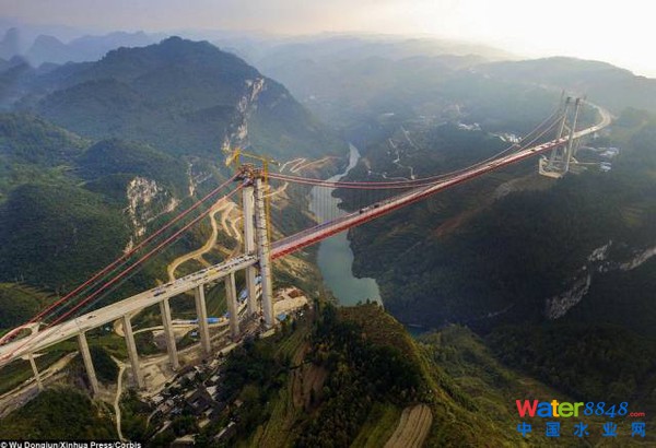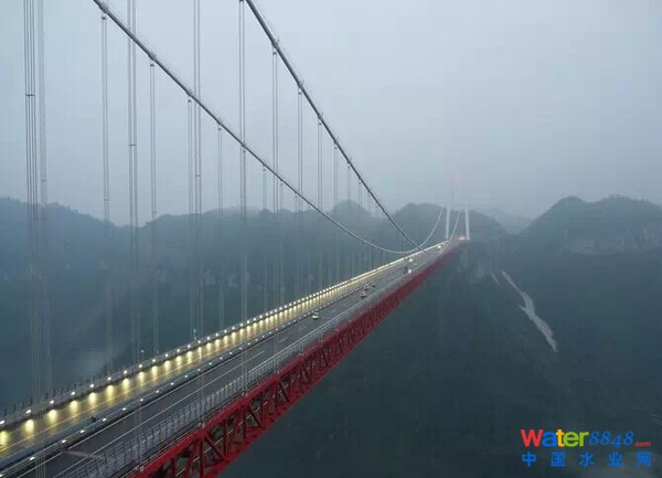 就連英國媒體近日也刊登報道了這一宏偉工程:這座橋橋面至谷底深達406米,主跨1130米,花費2年、耗資15.4億完成。全世界僅有一座大橋比清水河大橋更高,不過這座橋也在中國,就是湖北四渡河大橋(高496米)。而美國舊金山那座聞名世界的“金門大橋”只有227米高。