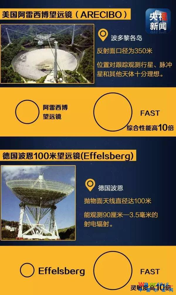 在FAST建成以前,世上已存的最大射電望遠鏡有兩個:一個是號稱“地面最大的機器”的德國波恩100米口徑望遠鏡,一個是被評為人類20世紀十大工程之首的美國阿雷西博望遠鏡,其反射面口徑為350米。