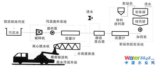 我公司制造的污泥脫水成套設(shè)備的工藝流程圖如下(主要由六大部分組成):