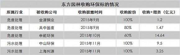 傳統(tǒng)園林業(yè)務面臨困局,原綠化龍頭東方園林謀求轉(zhuǎn)型。2015年下半年,公司投入約30億元先后收購了五家環(huán)保公司,切入污水處理、固廢處理等領(lǐng)域。