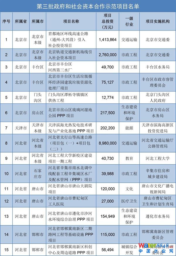 一、經(jīng)有關(guān)省、自治區(qū)、直轄市、計劃單列市和部委推薦及專家評審,現(xiàn)確定北京市首都地區(qū)環(huán)線高速公路(通州—大興段)等516個項目作為第三批PPP示范項目(詳見附件),計劃總投資金額11,708億元。