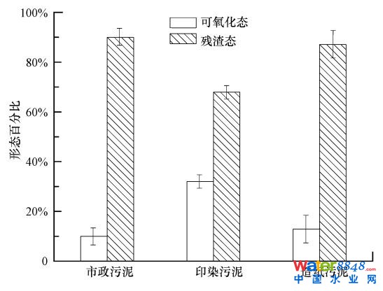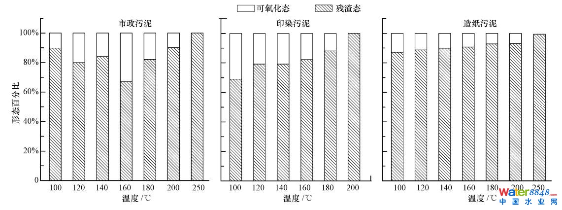 圖 4顯示了常溫下新鮮污泥中汞的形態(tài)分特征.從圖 4可以看出,在常溫條件下,3種新鮮污泥中只存在可氧化態(tài)和殘渣態(tài)2種形態(tài)的汞.市政污泥、印染污泥、造紙污泥中可氧化態(tài)汞和殘渣態(tài)汞所占比例分別為10%、33%、13%和90%、67%、87%,這表明污泥中不存在酸溶性汞和與可還原性Fe-Mn氧化物結合的汞,污泥中存在的汞除了部分與有機活性基團及硫離子相結合外,大部分結合在原生或次生礦物中.污泥中汞的這種形態(tài)分布特征揭示了污泥中存在具有潛在環(huán)境毒性的可氧化態(tài)汞,在3種被試污泥中印染污泥的潛在危害性相對較大.
