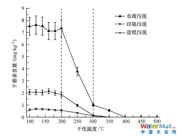 當干化溫度在>200~300 ℃的條件下,3種污泥中的汞含量均出現(xiàn)大幅度地下降,在干化溫度為300 ℃時,市政污泥、印染污泥和造紙污泥中干基汞含量分別為1.009、0.140和0.107 mg ˙ kg-1,相對于100 ℃下干基汞含量,汞的殘留率分別為13.4%、6.7%和17.7%.這表明在該溫度區(qū)間內,污泥中的汞是不穩(wěn)定的,隨著污泥中有機物開始發(fā)生大量的熱解,使得污泥中一部分汞的化合物分解,這必然導致汞的大量析出.當干化溫度大于400 ℃時,污泥中幾乎所有的汞全部析出,這是污泥中汞的附著體消失的必然結果,因為在這樣的高溫下,污泥中的全部有機物及汞的化合物(如HgS)均發(fā)生了熱解.