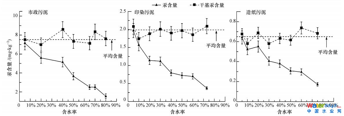 污泥含水率和汞含量之間關系的實驗:將3種污泥各稱取(10.00±0.05)g,放入坩堝,在100 ℃條件下進行干化,每隔5 min取出稱取重量,同時分別測定含水率和分析汞含量.每種污泥3組平行處理.為了便于比較,引入干基汞含量的概念,即除去水分后的干污泥中汞的含量.