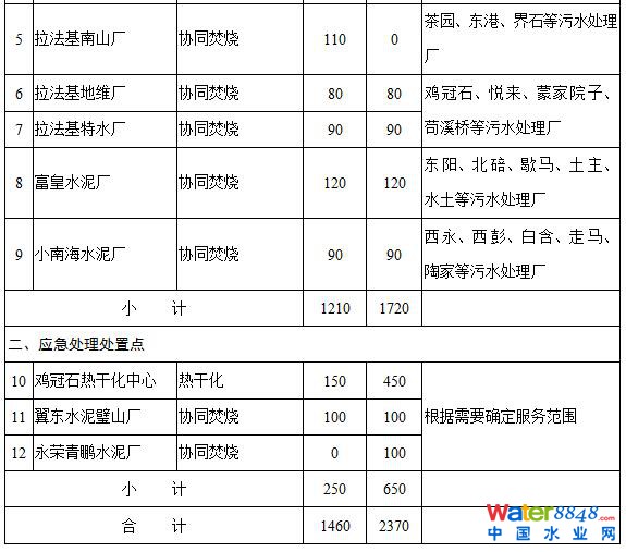 主城區(qū)現(xiàn)有拉法基瑞安水泥有限公司重慶分公司南山廠、地維廠、特水廠,重慶市富皇水泥廠,重慶市小南海水泥廠等5家水泥廠協(xié)同處理處置點(diǎn)和重慶鼎旺環(huán)保園林有限公司、唐家沱熱干化處置中心繼續(xù)保留(部分水泥廠關(guān)停后自動(dòng)終止)。新增黑石子餐廚垃圾處理廠、重慶升上源環(huán)境治理有限公司為主城區(qū)污泥協(xié)同處理處置點(diǎn)。2016年常規(guī)處理處置能力達(dá)到1210噸/日,2020年常規(guī)處理處置能力達(dá)到1720噸/日。