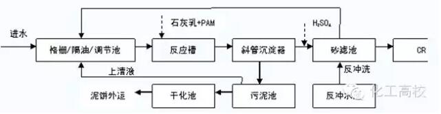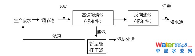 自來水廠的生產(chǎn)廢水主要來自沉淀池或澄清池排泥水和濾池反沖洗廢水,其中包含了原水中的雜質(zhì)以及水廠投加的藥劑殘留物,其水量一般約占水廠總制水量的3%~7%,由于環(huán)境保護(hù)的需要,這部分泥水不能直接排放,另外水資源成本越來越高,因此需對(duì)這部分水進(jìn)行合理的回收處理和污泥脫水處置。工藝如下: