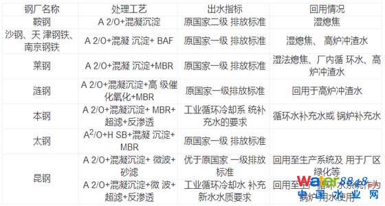 為了提高焦化廢水的處理效果,人們?cè)贏/O工藝的基礎(chǔ)上開(kāi)發(fā)了A2/O生化處理工藝,該工藝運(yùn)行穩(wěn)定,對(duì)氮和磷具有較好的去除效果,是目前國(guó)內(nèi)焦化廢水處理應(yīng)用最為廣泛的生化工藝,在國(guó)內(nèi)鋼廠的主要應(yīng)用如表2所示