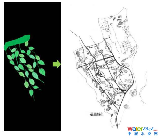 由中國工程院院士崔愷提出的關(guān)于“蔓藤城市”規(guī)劃策略,以建筑、城市跟環(huán)境、自然相融合的理念解決城市發(fā)展的可持續(xù)性問題。“蔓藤城市”設(shè)計理念,是一種組團(tuán)式的規(guī)劃結(jié)構(gòu),使城市發(fā)展融入風(fēng)景、保護(hù)田園。強(qiáng)調(diào)城市發(fā)展的過程猶如植物藤蔓生長一樣的可持續(xù)。它因地制宜,根植于當(dāng)?shù)厣鷳B(tài)環(huán)境、傳承地域文化,探索了一種新型田園城市的規(guī)劃模式。