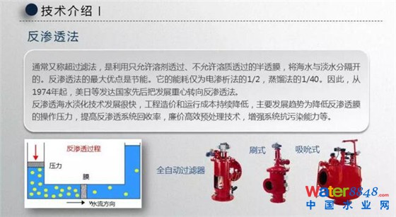 世界上首個海水淡化工廠1954年建于美國德克薩斯州。隨著水資源危機的加劇,海水淡化技術(shù)得到了加速發(fā)展。海水淡化已經(jīng)形成了以多級閃蒸法(MSF)、低溫多效蒸餾法(MED)和反滲透膜(RO)法為主要代表的工業(yè)化技術(shù),今后一個時期仍將以這3項技術(shù)為主,但RO法的比重將變大。