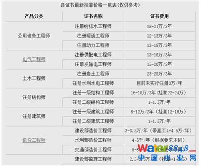 注冊(cè)會(huì)計(jì)師,4萬~4.5萬/年(掛法人);注冊(cè)一級(jí)消防工程師,8萬/年;注冊(cè)一級(jí)建筑工程師,8萬~12萬元/2年;注冊(cè)巖土工程師,25萬~28萬元/3年……近日,一張名為“2016年各證書最新掛靠?jī)r(jià)格一覽表”的表格流傳網(wǎng)絡(luò),一些通過率低的資格證書掛靠費(fèi)甚至超過一些職業(yè)的年均工資水平。