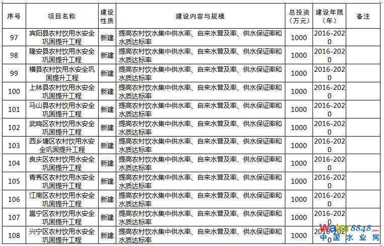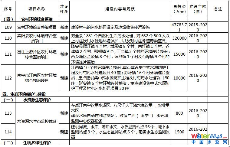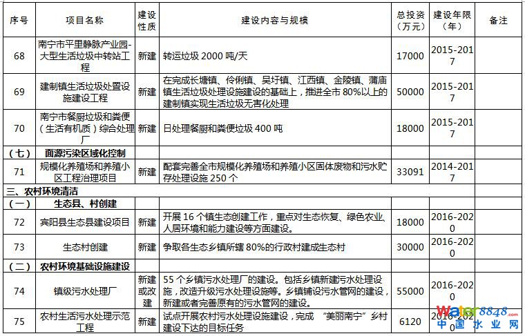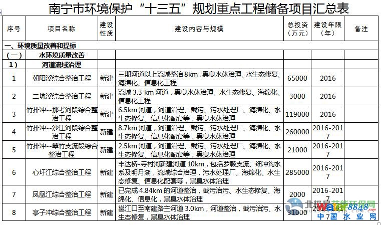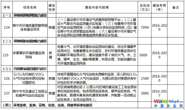 日前,《南寧市環(huán)境保護(hù)“十三五”規(guī)劃》已經(jīng)印發(fā)。規(guī)劃以提高環(huán)境質(zhì)量為主線,緊緊圍繞大氣、水體、土壤污染防治三大戰(zhàn)役,深入開展大氣、水、土壤環(huán)境質(zhì)量改善項(xiàng)目。規(guī)劃提到,開展大氣污染防治,全力推進(jìn)工業(yè)大氣二氧化硫和氮氧化物減排。全面推進(jìn)清潔生產(chǎn),推動工業(yè)鍋爐脫硫工作,以熱電聯(lián)產(chǎn)、工業(yè)園區(qū)統(tǒng)一供熱或清潔能源替代小型燃煤鍋爐,規(guī)模在20噸/小時以上的燃煤鍋爐要實(shí)施煙氣脫硫改造。持續(xù)推進(jìn)火電、有色冶煉、石油石化、水泥、陶瓷等行業(yè)脫硫脫硝工程,在火電、水泥、冶金、制糖等行業(yè)推行低氮燃燒技術(shù)。本規(guī)劃共列出重點(diǎn)工程142項(xiàng),總投資估算396.83億元,涉及大氣污染治理、污水處理、垃圾處理等環(huán)保項(xiàng)目。詳情如下:
