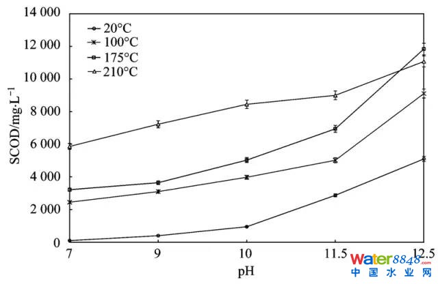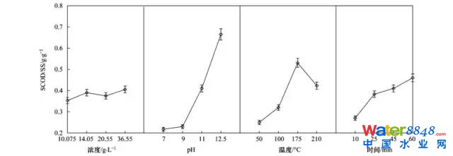 為了驗證正交試驗得出的單位污泥SCOD隨溫度和pH的變化趨勢,進行如下驗證試驗:采用8 mol ˙L-1 NaOH分別將污泥pH調(diào)節(jié)為6.9±0.1、 9.0±0.1、 10±0.1、 11.5±0.1、 12.5±0.1,并穩(wěn)定5 min. 再將上述5種不同pH值污泥分別置于20、 100、 175及210℃處理60 min,冷卻后進行相關(guān)分析,各做3組平行試驗. 1.3 分析方法