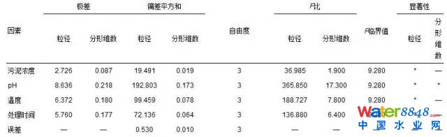 表 5 污泥粒徑及分形維數(shù)正交試驗極差及方差分析 1)