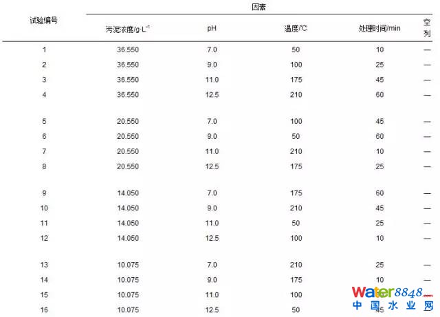 選擇污泥濃度、 pH、 溫度和處理時間4個因素,并取4個水平進行熱堿處理正交試驗,選擇L9(45)正交表,正交試驗設(shè)計表如表 1所示.