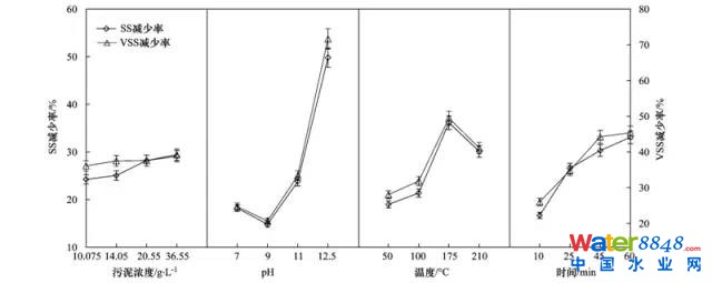 根據(jù)表 2中的試驗結(jié)果,可以得到污泥SS、 VSS減少率隨4個因素的變化(圖 3). 從圖 3中可知,SS、 VSS減少率隨處理時間延長和污泥濃度升高而升高,但隨污泥濃度的增加幅度小,這一變化規(guī)律與文獻一致. 此外,SS、 VSS減少率隨溫度的升高呈先升高后降低的趨勢,此趨勢與文獻一致. 但是,SS、 VSS減少率卻隨pH的升高呈先降低后升高的趨勢. 圖 3表明,在本試驗條件下,4個因素對熱堿處理降低SS、 VSS的最佳組合條件為:污泥濃度36.55 g ˙L-1、 pH 12.5、 溫度175℃和處理時間60 min. 對比單位污泥SCOD和污泥濃度(SS和VSS)的變化(表 2、 圖 1和圖 3)可知,4個因素對3個參數(shù)的影響相似,這主要是由于污泥SCOD的釋放來源于污泥絮體和微生物細胞的破裂、 融胞所釋放的有機物,有機物釋放會使一部分不溶性物質(zhì)轉(zhuǎn)化為溶解性物質(zhì),從而降低污泥濃度.