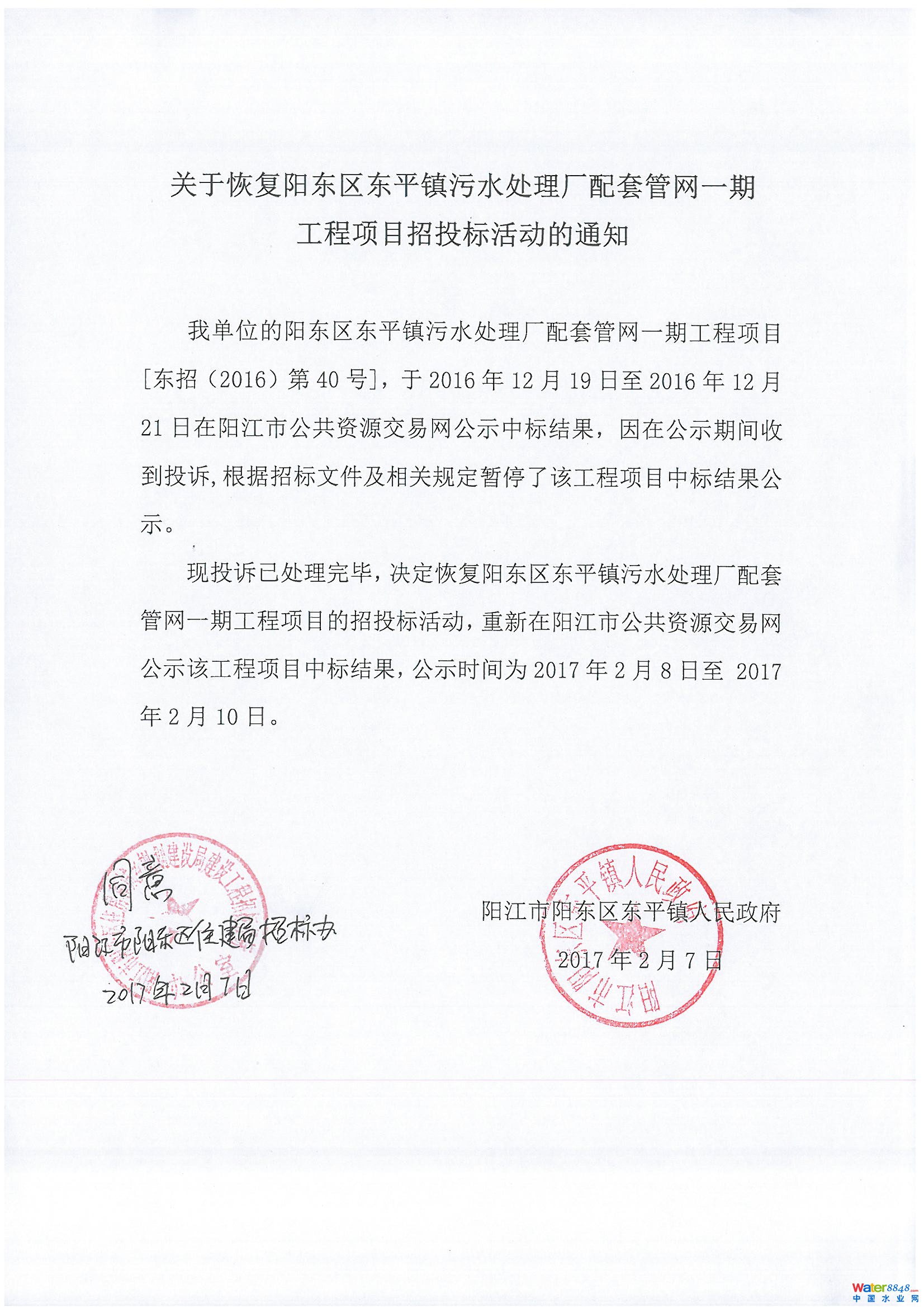 關(guān)于恢復(fù)陽(yáng)東區(qū)東平鎮(zhèn)污水處理廠配套管網(wǎng)一期工程項(xiàng)目招投標(biāo)活動(dòng)的通知