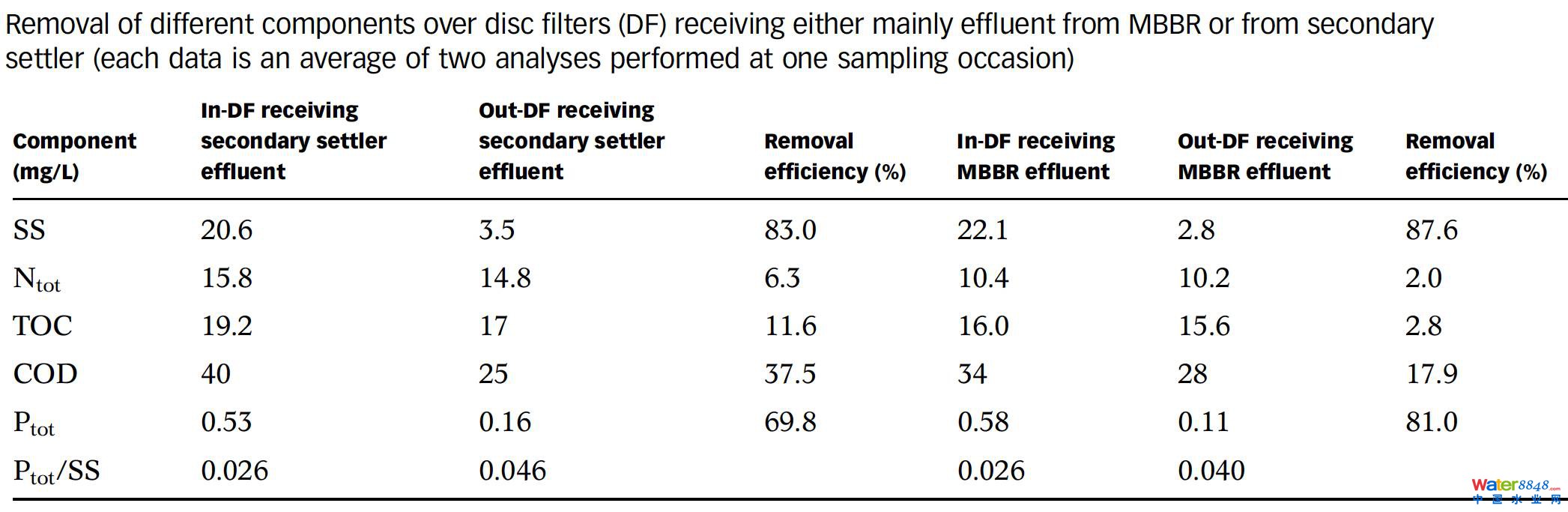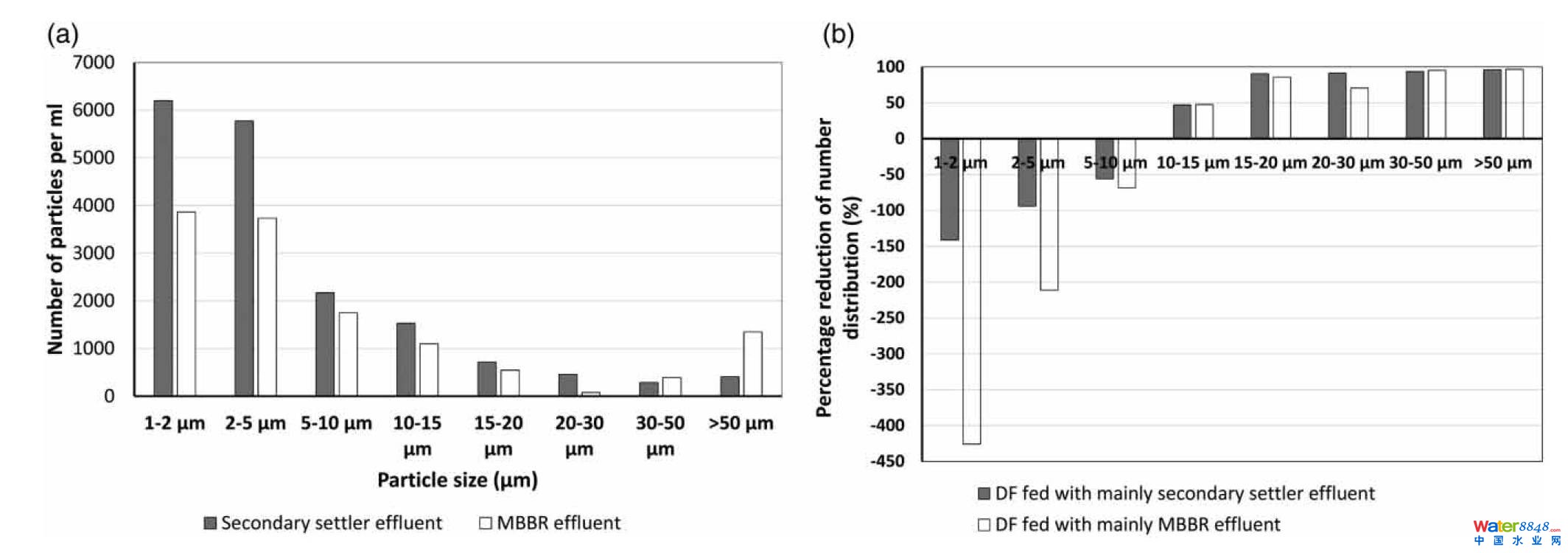 經(jīng)過盤式過濾器過濾之后,無論是二沉池還是MBBR出水中的大顆粒都有減少的趨勢(shì),過濾器出水的顆?讖蕉酁2– 5μm,但是這些粒子沒有對(duì)懸浮固體造成影響,所以懸浮固體的過濾效果還是明顯的。具體的過濾情況請(qǐng)參考下表。