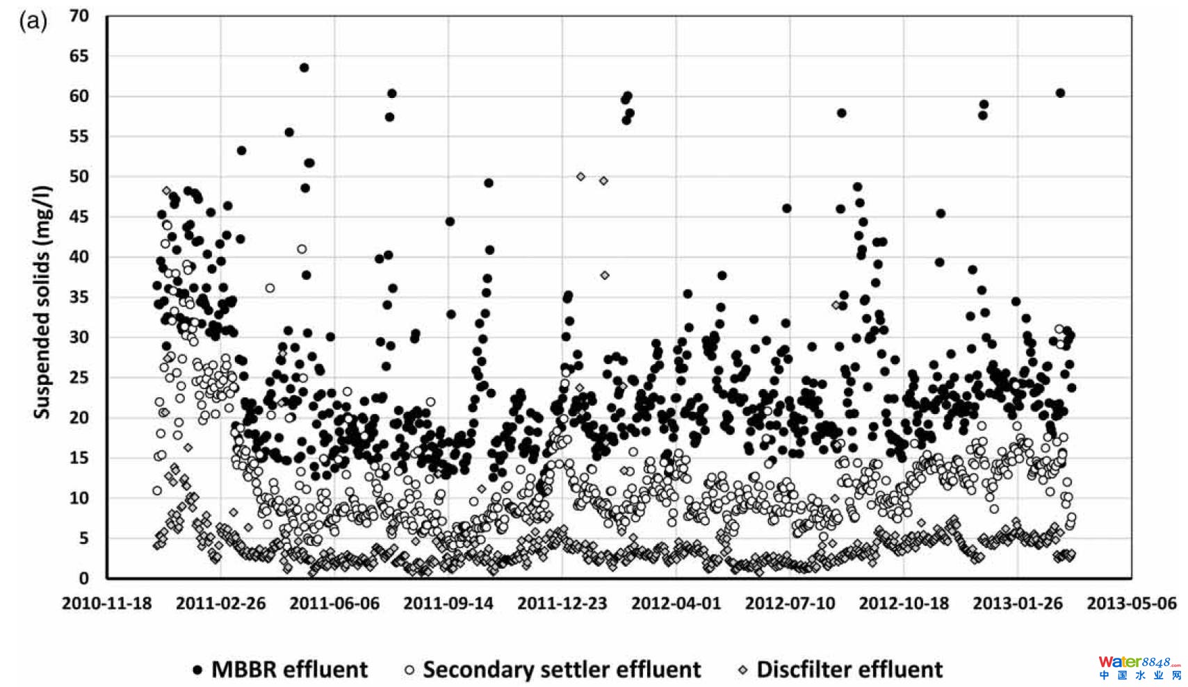 研究人員收集了從2011年1月到2013年3月的數(shù)據(jù)。2011年他們對(duì)幾種過濾器的性能做了一次詳細(xì)評(píng)估,內(nèi)容包括顆粒物的大小分析 (1– 400 μm)以及TOC、COD、氮磷以及致病微生物去除等指標(biāo)。同時(shí)也考察了四種不同孔徑規(guī)模的濾布(10, 15, 20 和40 μm)和兩種濾紙(1.2 和 0.45 μm),并對(duì)MBBR和二沉池的出水的過濾情況做對(duì)比。
