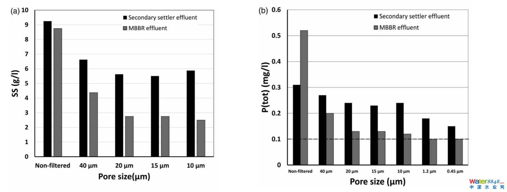 下圖顯示由于MBBR出水的懸浮固體粒徑更大,所以過濾效果更好。但盤式過濾器的總磷去除極限約為0.1 mg Ptot /L。同時(shí)10和15μm濾布的除磷效果沒有明顯差別,這個(gè)超前的評(píng)估結(jié)果吻合。