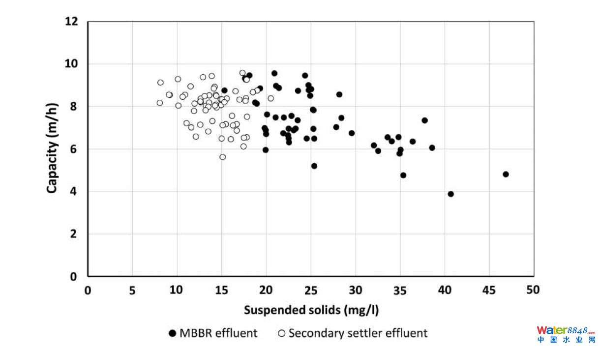 這里的水力處理能力表示為最大流量除以總過濾面積。如下圖所示,它隨懸浮固體濃度的增加而減少。這解釋了為什么處理MBBR時(shí)水力處理能力值會(huì)較低。