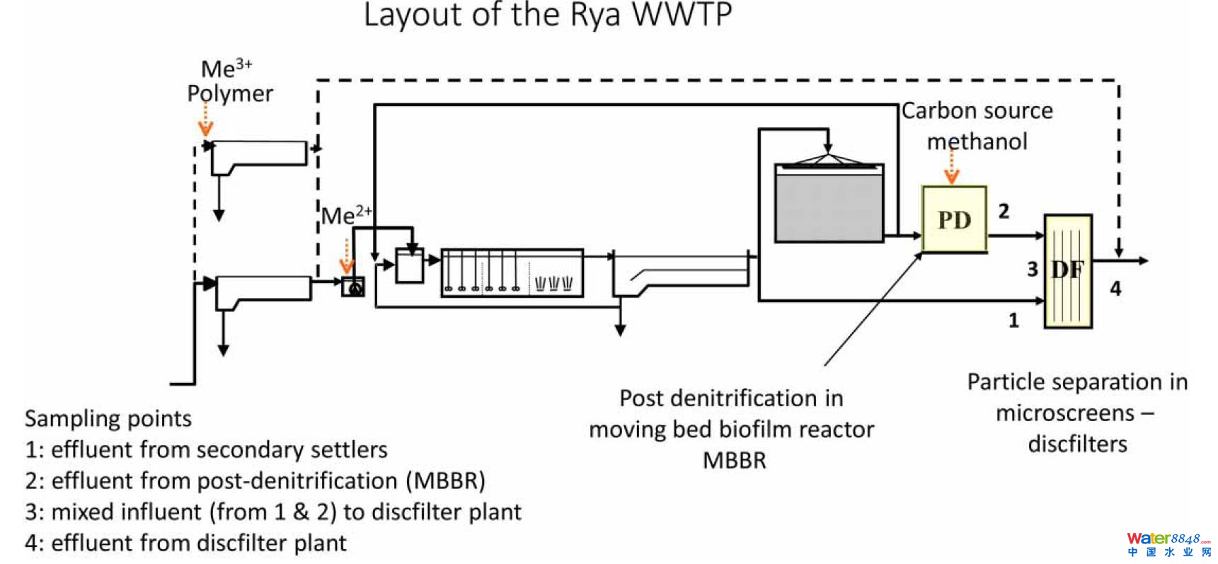 為了滿足新的出水標(biāo)準(zhǔn)(總氮10 mg/L ,總磷0.3 mg/L),2010年Rya污水廠進(jìn)行了擴(kuò)建,新增了基于MBBR工藝的反硝化池和用于三級(jí)過濾的盤式過濾器。盤式過濾器接受來自MBBR和二沉池的出水。通過大量的中試,設(shè)計(jì)團(tuán)隊(duì)選用15微米的過濾材料,數(shù)據(jù)顯示這是去除懸浮固體最合適的尺寸。