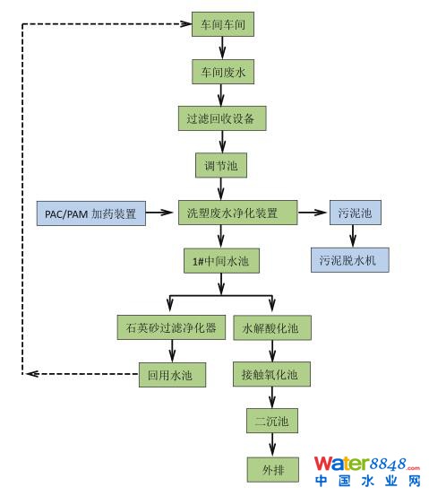 工藝說明:車間產(chǎn)生的廢塑料清洗廢水首先流入轉鼓式過濾機,經(jīng)過初步過濾后流入調(diào)節(jié)池。調(diào)節(jié)池中的廢水被泵送到管道混合器,與由加藥裝置加入的藥劑混合,進入氣浮凈化裝置。處理后的廢水流入中間水池,被泵送到高效凈水器進行進一步凈化。凈化后達到回用標準的回水流入回用水池,供生產(chǎn)使用。氣浮凈化裝置和高效凈水器中產(chǎn)生的淤泥被送入污泥濃縮池,隨后被泵入污泥脫水機,并與加藥裝置加入的藥劑混合,進行處理。處理后的污泥被外送到專門的污泥處理廠集中處理。