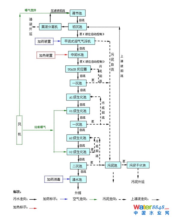 平流式溶氣氣浮沉淀的污泥與沉淀池沉淀的污泥均流入污泥池,由泵提入污泥脫水間進行泥水分離,脫水后的泥餅外運。