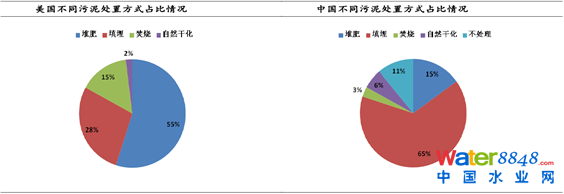 在2010年,從中美處置方法看,美國55%的污泥是用作土地利用,而中國目前還是以填埋為主。但是隨著技術手段的進步,以及填埋場地的稀缺,未來綜合利用一定也將是我國污泥處置的方向。2010年數(shù)據(jù)如下,數(shù)據(jù)太老,僅做參考。