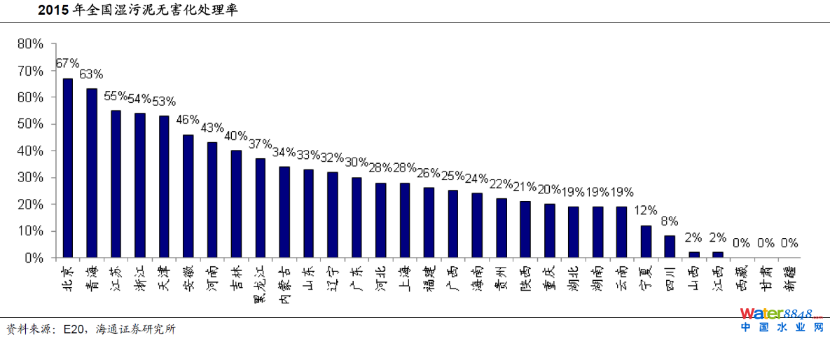 2015 年新建污泥無害化處理能力520 萬噸/年,同比增長41%。全國濕污泥平均無害化處理率32%,北京(67%)、青海(63%)、江蘇(55%)位列前三,西藏(0%)、甘肅(0%)、新疆(0%)位列后三。