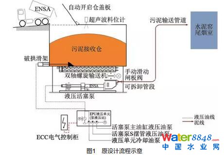 HZ公司原采用德國PM公司的技術(shù)產(chǎn)品,具體流程見圖1,城市生活污泥經(jīng)過汽車運輸至工廠后卸入污泥料倉,污泥在液壓破拱滑架的推送下經(jīng)過雙軸螺旋輸送機進入液壓污泥泵,在污泥泵擠壓輸送作用下經(jīng)過污泥管道輸送至水泥窯尾煙室,進入水泥窯內(nèi)焚燒。
