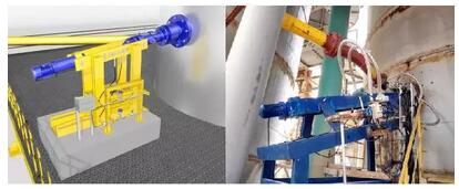 在本項目中污泥通過柱塞泵輸送至窯尾投加點,污泥在管道內(nèi)呈柱狀流形態(tài),根據(jù)柱塞泵換向速率不同,呈現(xiàn)為不同的脈沖柱狀流進入窯尾煙室,污泥從管道內(nèi)沖出后會直接掉到煙室斜坡上,并裹挾著生料直接沖入回轉(zhuǎn)窯內(nèi),在窯內(nèi)吸熱后急劇膨脹、氣化、直至完全焚燒。