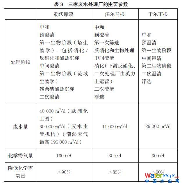 科倫塔公司(前身拜耳工業(yè)服務(wù)公司)由拜耳股份公司與朗盛集團(tuán)合資組建,兩家公司分別占股60% 和40%?苽愃臼菤W洲化工園的管理者和經(jīng)營者,該工業(yè)園由化工行業(yè)逾70 家公司組成,員工總數(shù)45 000 人,分布于勒沃庫森、多爾馬根和于爾丁根的三個(gè)園區(qū),并共同構(gòu)成了德國最大的化工園區(qū)網(wǎng)。歐洲化工園園區(qū)的水和廢水管理工作由科倫塔公司負(fù)責(zé)?苽愃矩(fù)責(zé)管理三家廢水處理廠,工業(yè)廢水總量達(dá)80 000 m3/d。