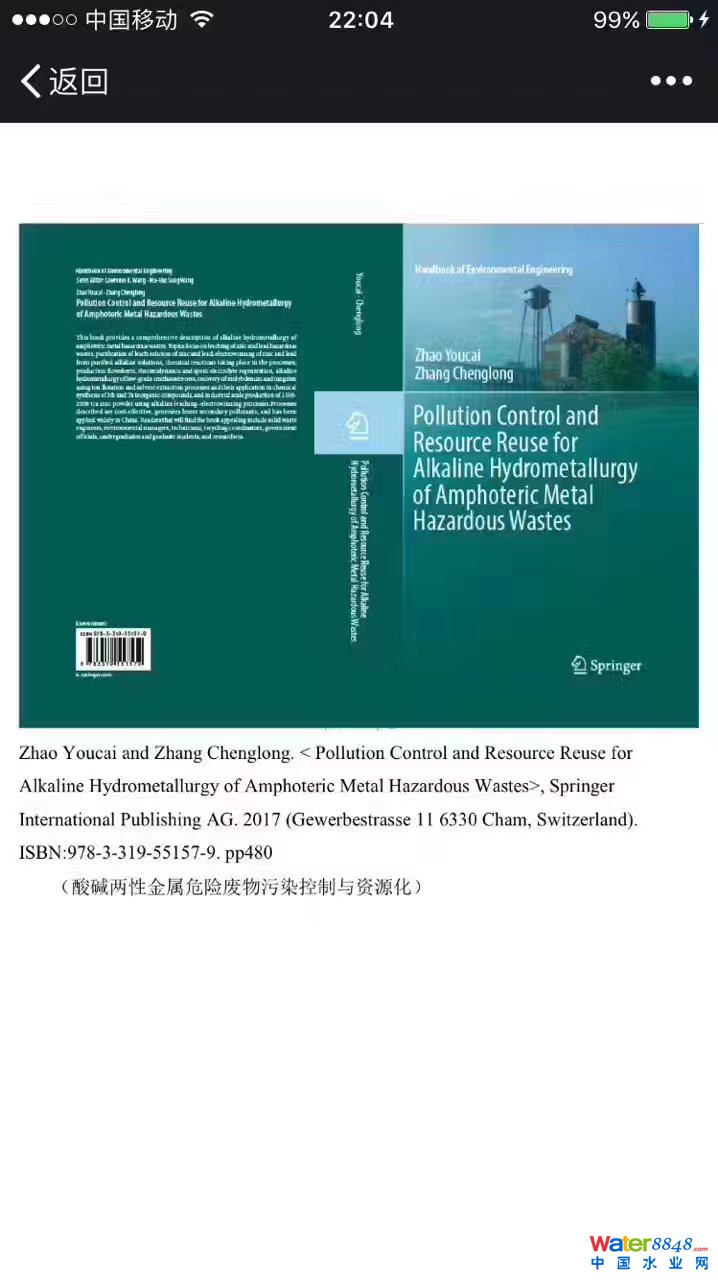 5 Zhao Youcai and Zhang Chenglong. < Pollution Control and Resource Reuse for Alkaline Hydrometallurgy of Amphoteric Metal Hazardous Wastes>, Springer International Publishing AG. 2017 (Gewerbestrasse 11 6330 Cham, Switzerland). ISBN:978-3-319-55157-9. pp480