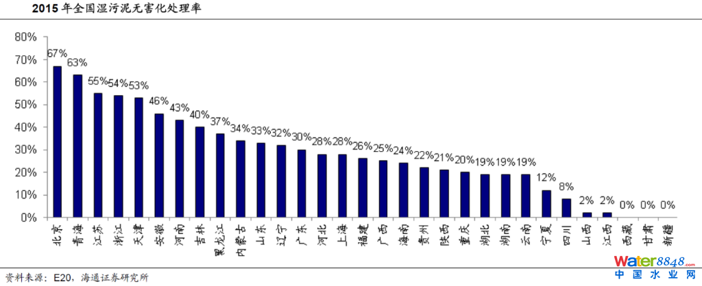 2015 年新建污泥無害化處理能力520 萬噸/年,同比增長41%。全國濕污泥平均無害化處理率32%,北京(67%)、青海(63%)、江蘇(55%)位列前三,西藏(0%)、甘肅(0%)、新疆(0%)位列后三。