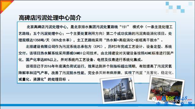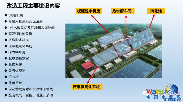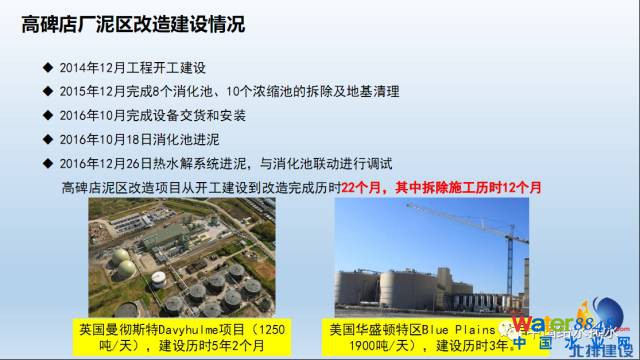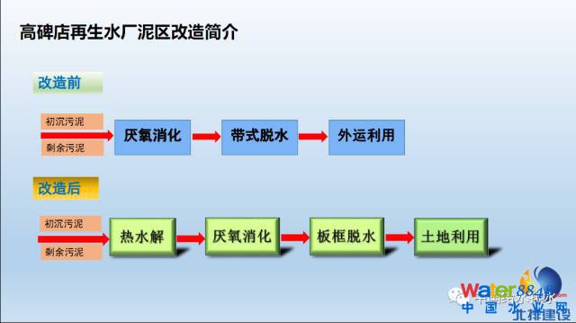關(guān)于改造前和改造后的高碑店污泥處置中心的工藝路線,主要就是新增了熱水解單元,對原有的消化池進(jìn)行了改造,新增板框脫水機(jī)房,同時板框?yàn)V液采用了北排研發(fā)的紅菌技術(shù),這是整個改造工程的主要的建設(shè)內(nèi)容。
