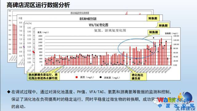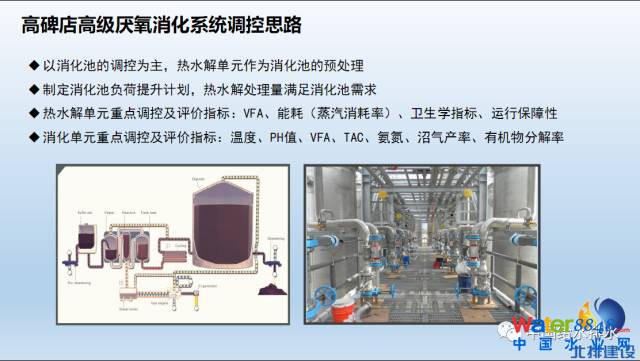 第二部分是我們調(diào)試的運(yùn)行分析。在調(diào)試過程之中,我們確定了以消化池調(diào)控為主,熱水解單元作為消化池的預(yù)處理,制定消化池負(fù)荷提升計劃,熱水解處理量滿足消化池需求,制定熱水解單元調(diào)控及評價指標(biāo),消化單元重點(diǎn)調(diào)控及評價指標(biāo)。
