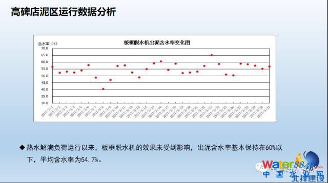 在調(diào)試過程中,通過對消化池溫度、PH值、VFA/TAC、氨氮和游離氨等數(shù)據(jù)的監(jiān)測和控制,保證了消化池在負(fù)荷提高時的穩(wěn)定運(yùn)行,同時平穩(wěn)度過微生物的轉(zhuǎn)換期,成功完成整個系統(tǒng)的啟動。隨著熱水解滿負(fù)荷運(yùn)行以來,板框脫水機(jī)的效果未受到影響,出泥含水率基本保持在60%以下,平均含水率為54.7%。