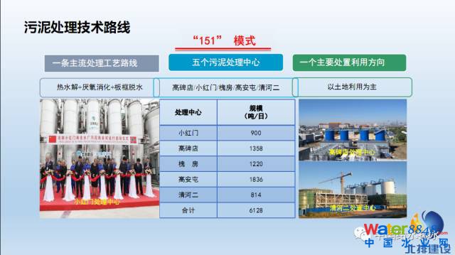 結(jié)合以上幾點(diǎn),我們以消化為基本,考慮到系統(tǒng)的能耗、生物固體品質(zhì)、衛(wèi)生學(xué)要求,依據(jù)現(xiàn)有污泥設(shè)備設(shè)施,系統(tǒng)集成商特點(diǎn)和經(jīng)驗(yàn)確定了污泥處理處置的技術(shù)路線。即形成“熱水解+高級厭氧消化+板框脫水+土地利用”污泥處理處置技術(shù)路線,從而使污泥處置達(dá)到無害化、穩(wěn)定化、減量化、資源化、低碳化處理目標(biāo)。建立了一條以“熱水解+厭氧消化+板框脫水”一條主流處理工藝路線,建立了一個151模式。下面我重點(diǎn)介紹一下高碑店污泥處理中心的情況。高碑店污泥處理中心是151模式中第二個處理的消化項(xiàng)目,處理規(guī)模達(dá)到1358噸每天,北排建設(shè)有限公司作為污泥項(xiàng)目系統(tǒng)的總承包方,歷時兩年完成工藝設(shè)計、設(shè)備定型,系統(tǒng)交付。目前高碑店項(xiàng)目在2016年年底已達(dá)到滿負(fù)荷試運(yùn)行,效果非常顯著,有效提高了污泥厭氧降解率和沼氣的產(chǎn)氣量,改善了污泥的脫水性能。