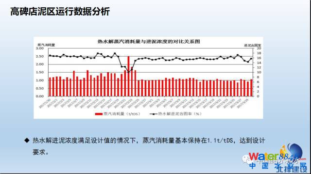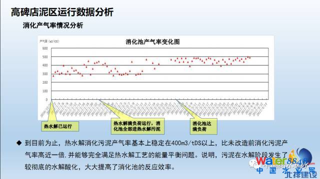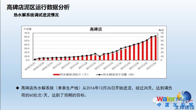 下面介紹一下具體的調(diào)試情況。高碑店熱水解系統(tǒng)(單條生產(chǎn)線)從2016年12月26日開始進(jìn)泥,經(jīng)過28天,達(dá)到滿負(fù)荷的60批次/天,達(dá)到了預(yù)期的目標(biāo)。同時,在熱水解進(jìn)泥濃度滿足設(shè)計值的情況下,蒸汽消耗量基本保持在1.1t/tDS,達(dá)到設(shè)計要求;到目前為止,熱水解消化污泥產(chǎn)氣率基本上穩(wěn)定在400m3/tDS以上,比未改造前消化污泥產(chǎn)氣率高近一倍,并能夠完全滿足熱水解工藝的能量平衡問題。說明,污泥在水解階段發(fā)生了較徹底的水解酸化,大大提高了消化池的反應(yīng)效率。在圖表中我們可以看到隨著熱水解的啟動,產(chǎn)氣率逐漸從不到三百慢慢提升,一直穩(wěn)定在400左右,甚至高的時候可以接近500。