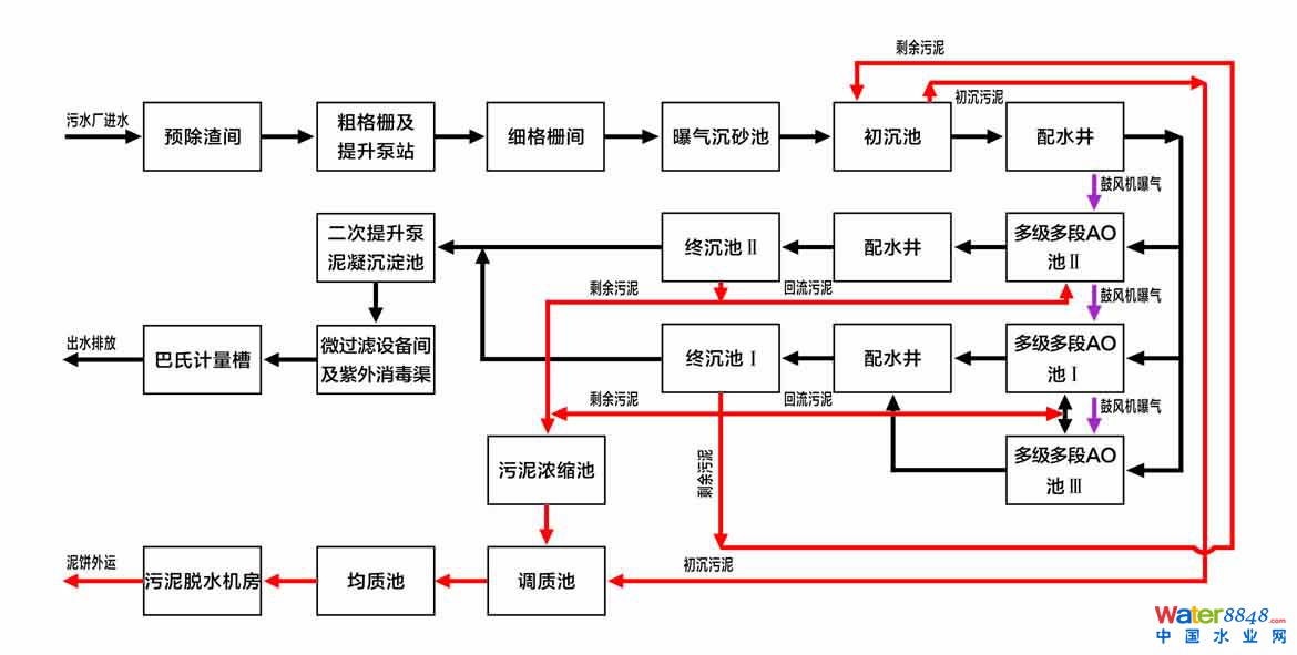 該廠于1956年開始建設(shè),1958年建成投入運(yùn)行,1963年、1976年、1999年先后進(jìn)行過三次改擴(kuò)建。2014年由中國市政工程西北設(shè)計(jì)研究院有限公司和中鐵一局集團(tuán)聯(lián)合EPC總承包,進(jìn)行第四次擴(kuò)建改造,處理能力12×104m3/d,處理深度為三級(jí)處理。污水處理采用“多段多級(jí)AO+絮凝沉淀+微過濾”工藝,污泥處理采用“重力濃縮+機(jī)械脫水”工藝,除臭處理采用“CYYF 全過程除臭”工藝。污水經(jīng)進(jìn)水分流井、預(yù)除渣間到粗格柵進(jìn)入提升泵房,由單管出水井到細(xì)格柵、曝氣沉砂池,經(jīng)初次沉淀池后,進(jìn)入多級(jí)多段AO工藝處理,終沉池出水經(jīng)二次提升泵房二次提升后,經(jīng)混凝沉淀池、微過濾設(shè)備間、次氯酸鈉輔助紫外消毒渠深度處理后,排放至皂河。CYYF 全過程除臭將含有組合生物填料的培養(yǎng)箱安裝于污水處理廠生物池內(nèi),實(shí)現(xiàn)污水廠惡臭的全過程控制。剩余活性污泥經(jīng)重力濃縮后,進(jìn)行機(jī)械脫水。