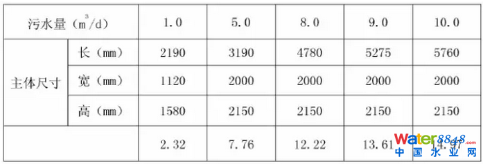 凈化槽為日本分散式污水處理設(shè)備,在日本國內(nèi)大面積、大范圍的使用,經(jīng)其實際運行檢驗,運行穩(wěn)定、效果良好。傳統(tǒng)凈化槽處理規(guī)模在1.0-10.0m3/d。其污水處理量與尺寸對應(yīng)見表2。