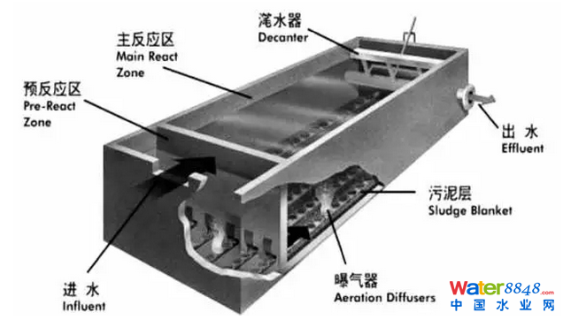 SBR處理設(shè)備。采用續(xù)批式活性污泥法(SBR),工序為進水—曝氣—沉淀—排水,采用時間編程自動控制技術(shù)(見圖2)。