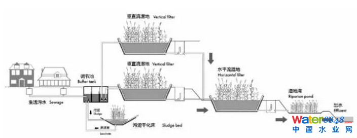 組合型人工濕地。組合型生態(tài)濕地可用于分散或集中的村莊生活污水處理,一般適用于20戶以上(水量10t/d以上)的村莊,以保證經(jīng)濟性。生態(tài)濕地一般可以借用原有地形和高差,同時因濕地景觀性好,特別適用于星級村莊、美麗村莊等村莊改造工程,可增加景觀和多功能性,減少原有景觀投資(見圖3)。