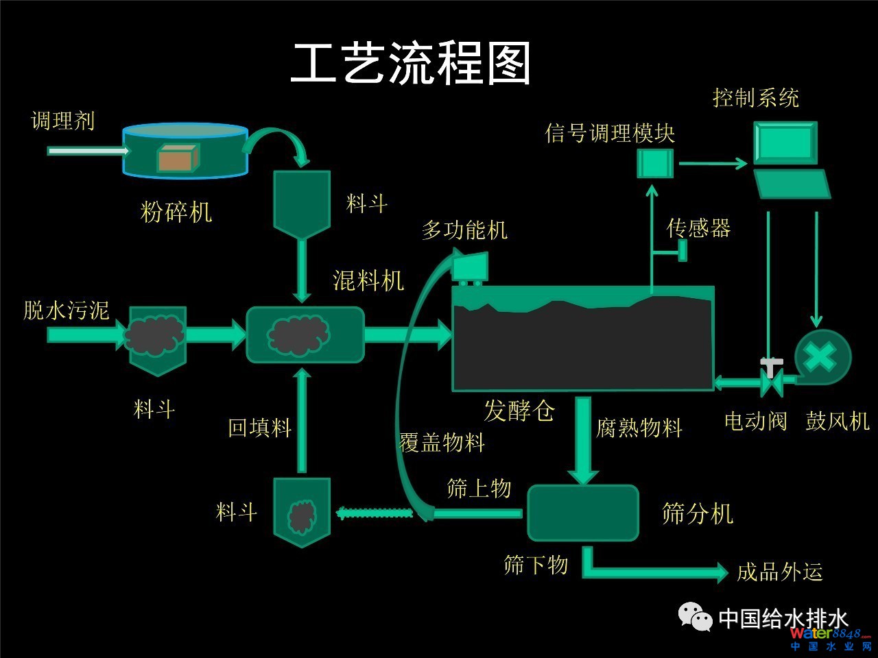 (詳見PPT)這是堆體的工藝流程圖,原料來了,經(jīng)過一個混料,混料以后進入發(fā)酵池,帶發(fā)酵池經(jīng)過一定階段的發(fā)酵。因一堆體里面時間長了有一些壓實的作用,這樣對堆體內(nèi)部補充氧氣、通風,包括水分的散失、臭氣的控制都會產(chǎn)生一些不良的影響。這時候就要對它進行一個翻拋,翻拋以后讓物料輸送,讓物料均勻,進氣也能夠均勻一點,這樣出來的產(chǎn)品可能會比較好。通過篩分一些堆肥可以代替調(diào)理劑,代替秸稈的采購。在這個工藝流程圖當中看到是一個眼花繚亂的東西,在這里面有幾個關(guān)鍵的設(shè)備,自動控制方面的設(shè)備,調(diào)理劑要做那些東西,發(fā)酵池的設(shè)計,最終產(chǎn)品的設(shè)計。