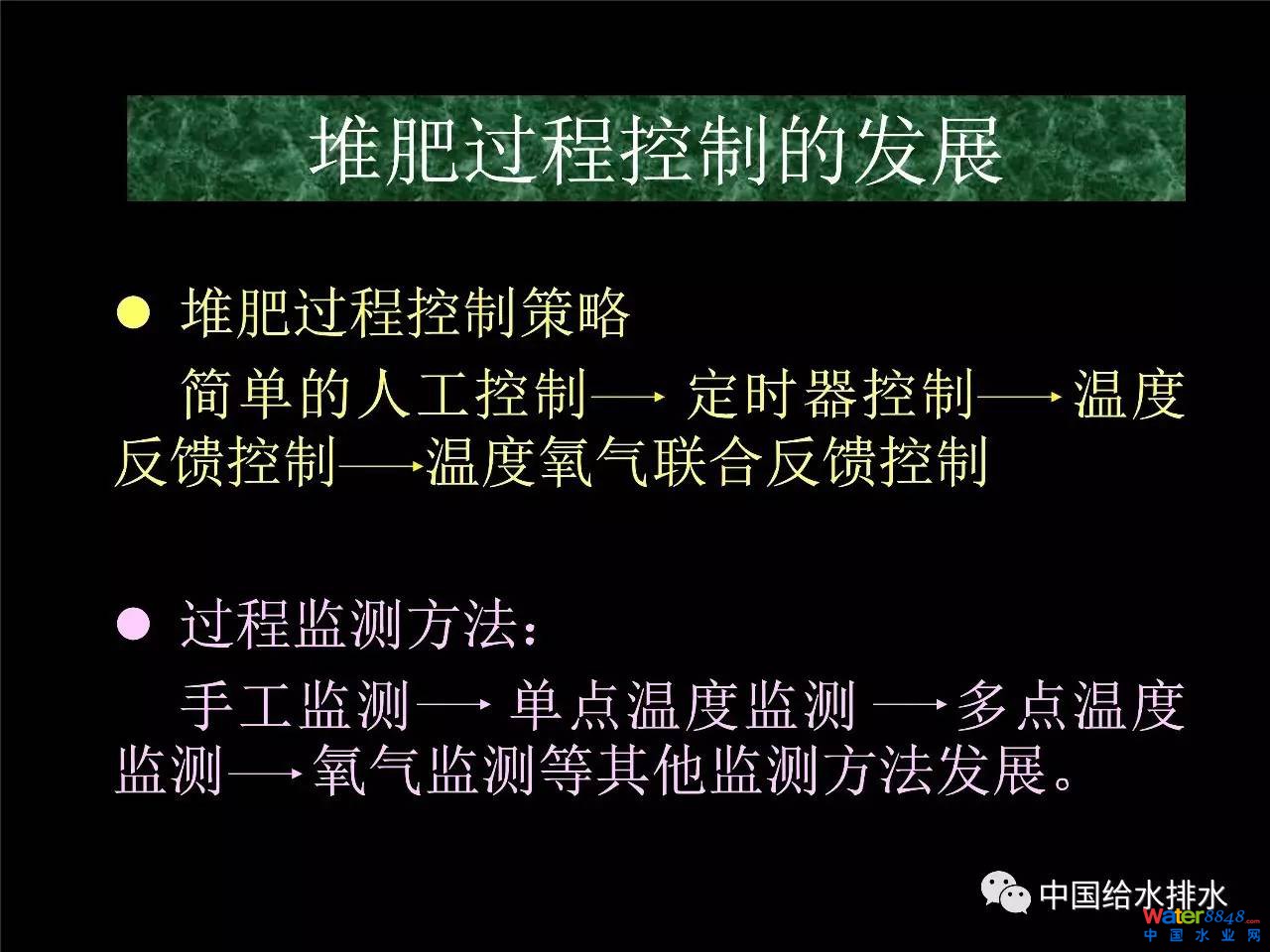 對于控制來說,產(chǎn)品質(zhì)量不穩(wěn)定,要進行一個良好的控制。良好的控制就要堆肥過程當中那些關(guān)鍵因素是重要的,在這里面比如說氧氣的問題,溫度的水平、水分的問題,它的臭氣的問題。檢測問題,咱們過去的技術(shù)比較落后,以前的房前屋后農(nóng)民堆肥,靠看一看、摸一摸,溫度起來了沒有,后來拿溫度計量一量,后來溫度可以自動量。上午還有專家講到紅外,咱們的檢測手段先進了。正因為檢測手段先進了,控制技術(shù)可以隨著發(fā)展進步。像控制手段有人工控制、單點溫度,人工控制變成定時器的控制、溫度的反饋控制,最后有溫度和氧氣聯(lián)合反饋控制,這是控制策略發(fā)生的變化?刂撇呗园l(fā)生的變化正式因為我們檢測手段發(fā)展的結(jié)果。