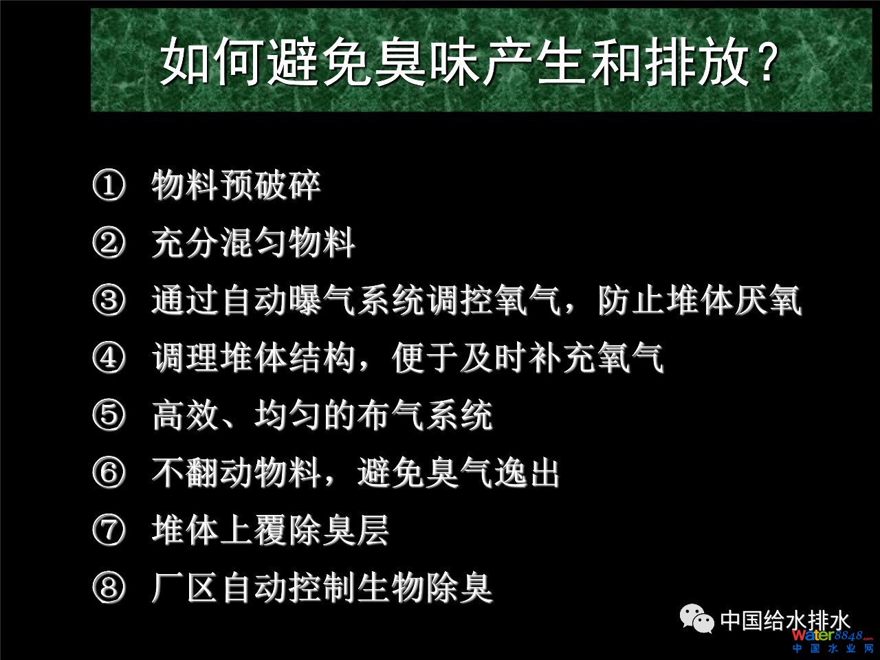 怎么做源頭減量和過程控制呢?中間是堆肥物料組成,如果是有氧氣的條件下,產(chǎn)生的是二氧化碳和水,當然有少許氨氣;如果是厭氧條件下產(chǎn)生的物質(zhì)就復(fù)雜了,硫化物等等、VOC都出來了,VOC就是咱們所說的臭氣成分。良好的氧氣供應(yīng)是堆肥過程中臭氣控制非常關(guān)鍵的因素,我們要減少堆肥過程的臭氣產(chǎn)生就要保持良好的氧氣供應(yīng)。