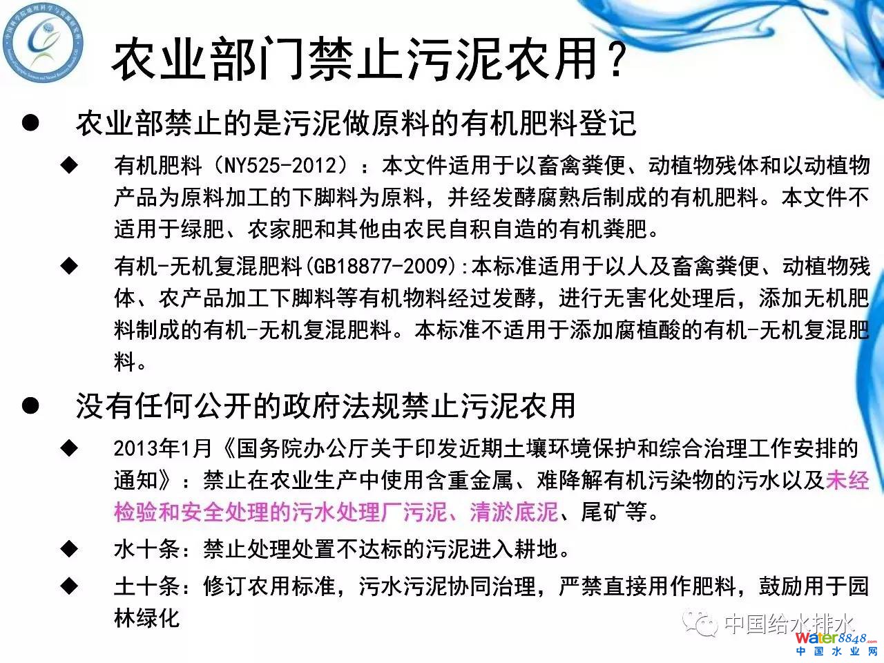 農(nóng)業(yè)部門從來沒有禁止污泥農(nóng)用。農(nóng)業(yè)部門是禁止污泥做原料登記商品有機肥,也沒有明文規(guī)定反對污泥農(nóng)用,但是想獲得一個肥料登記證跟人家搶市場是不允許的。包括咱們國家的一些規(guī)章制度,包括一些現(xiàn)行的標準都沒有禁止污泥農(nóng)用的。