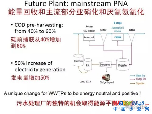 到2025年新加坡三個(gè)水廠建成的時(shí)候,能量回收的情況如何呢?污水處理最大的困境就是碳的管理,本身讓碳源要用來(lái)去除營(yíng)養(yǎng)物又產(chǎn)能源的時(shí)候,是很難兩全其美的,這就是我們現(xiàn)在要談主流厭氧氨氧化的問(wèn)題。未來(lái)處理廠的概念,如果這概念廠能實(shí)現(xiàn),今后的處理廠可可以把盡量多的碳拿下來(lái)送到厭氧消化里面去產(chǎn)生能源。但是條件是什么呢?后面的營(yíng)養(yǎng)物的去除不需要碳源,或者是需要的很少,這就提供了一種能源平衡和剩余的可能性。比如說(shuō)我們先的現(xiàn)在的初沉池碳去除是40%,你就可以增長(zhǎng)到60%,相當(dāng)于50%能源的增加。