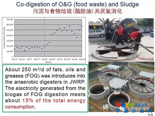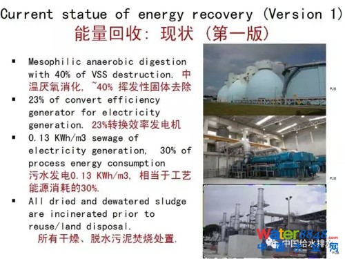 如果抓住這幾個(gè)環(huán)節(jié)以后,就可以有相當(dāng)?shù)碾娔艿幕厥,即我們稱(chēng)之為能源回收的第一版。目前,在新加坡所有的污泥都進(jìn)行中溫的厭氧消化,固體揮發(fā)物的去除率是大約40%,達(dá)到國(guó)際上的公認(rèn)的水平。
