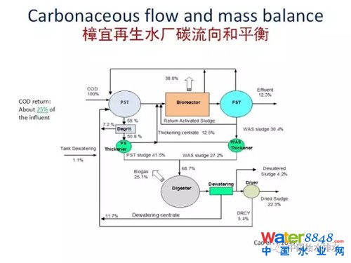 這張圖是整個(gè)廠里面碳的流向,你可以看到每一個(gè)過(guò)程碳的分布,而重要的是有多少碳進(jìn)入了厭氧消化池,而產(chǎn)生的多少甲烷氣。